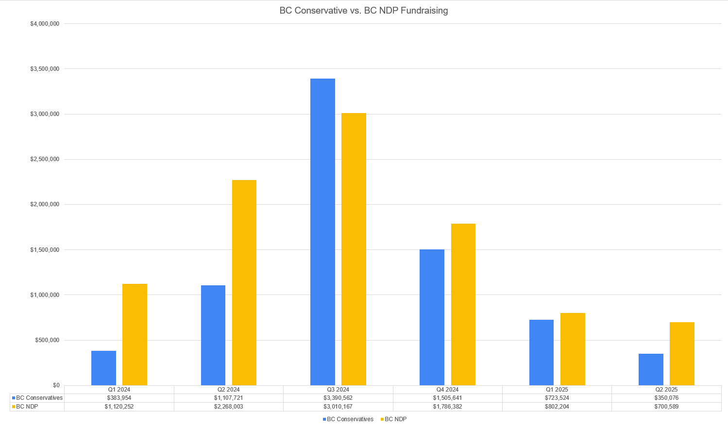 According to BC elections data, the BC Conservative party raised a little over $350,000, a small amount compared to the BC NDP’s $700,589. This is the BC Conservatives' worst fundraising quarter since the beginning of last year, even during the party’s drama with the BC United political party.