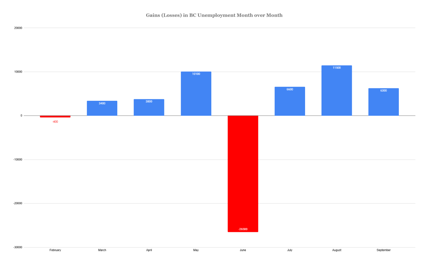 Gains and losses in BC unemployment by personnel. Information retrieved from Statistics Canada.