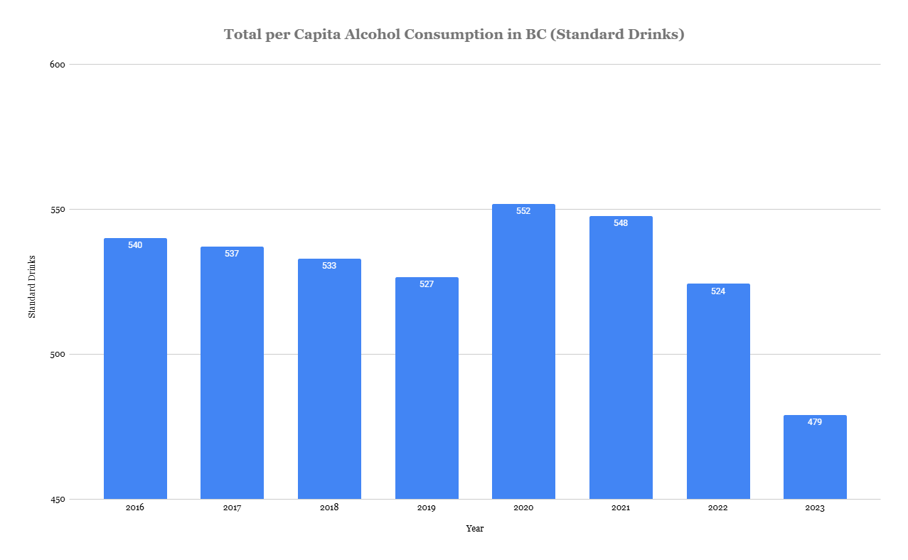According to the Canadian Institute for Substance Use Research, centered at the University of Victoria, the average amount of absolute alcohol consumed in BC has gone down from 540 Standard Drinks per person to 479 Standard Drinks per person. This number was generated based on estimations provided by the sale alcohol data from the BC Liquor Distribution Branch and the Ubrew/Uvin data from the BC Liquor Control and Licensing Branch. If these figures seem high, that’s because the heaviest drinkers drag the average up. According to a 2024 study, by volume, the top 10 percent of drinkers consume 45.9 percent of the total ethanol among males and 47.1 percent of the total ethanol among females.