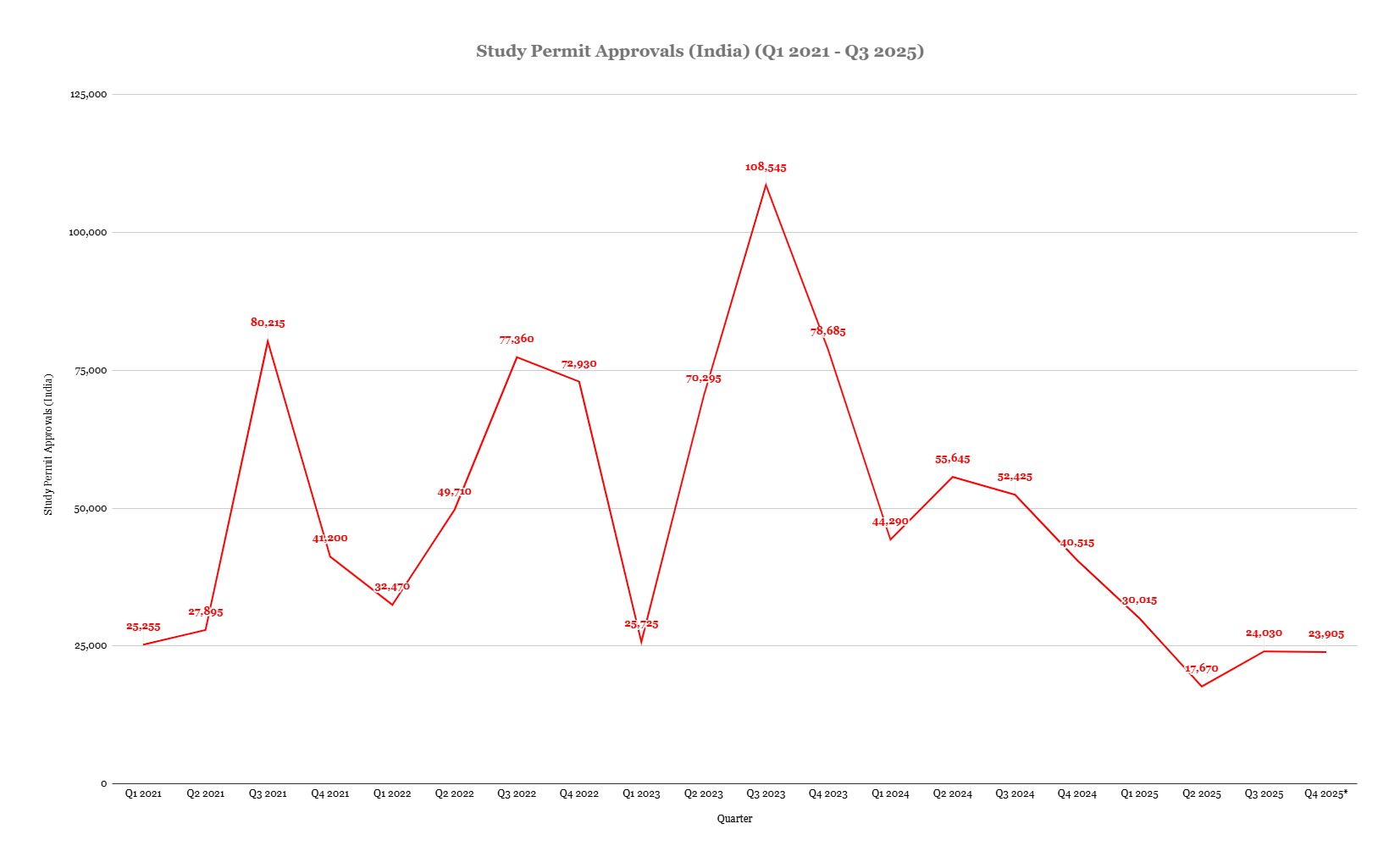 So far, according to immigration data released by the federal government, only 70,180 Indian citizens have been granted approvals for study permits in 2025. This time last year, 152,360 Indians were granted study permits.