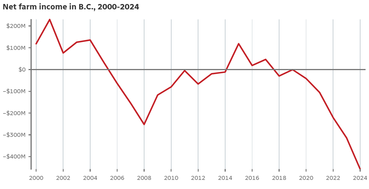Beyond the immediate labour and fiscal issues detailed by Angus Reid, several policy files have added to the sense of strain in BC’s economy. Coastal Front’s reporting in July highlighted deep losses in the province’s agricultural sector, citing Statistics Canada data showing a $457 million net farm income loss in 2024 — the largest in the country — and a broader pattern of farms failing to turn a profit since 2017. Industry sources noted compounding pressures, from land costs and interest rates to climate-related disasters.