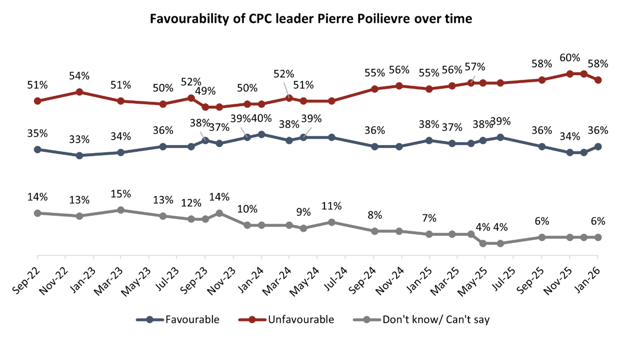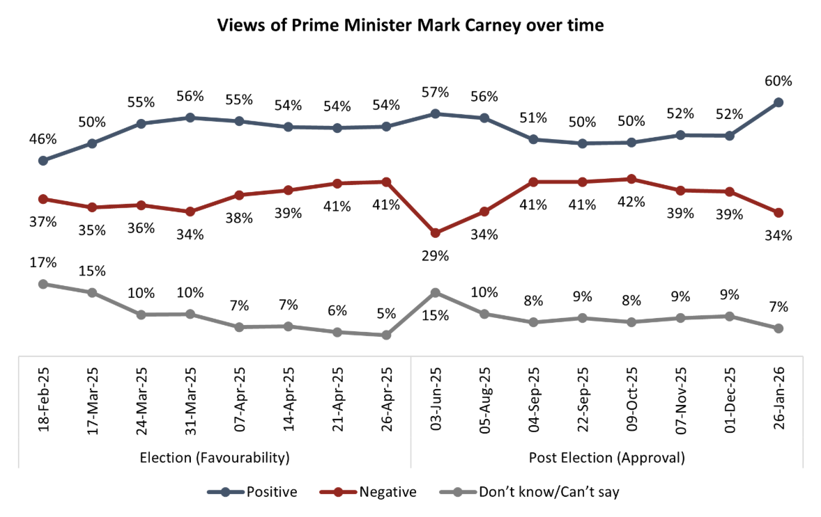 Carney recorded the highest approval rating among federal leaders at 55 percent. Conservative Leader Pierre Poilievre stood at 39 percent, an eight-point decline since September.