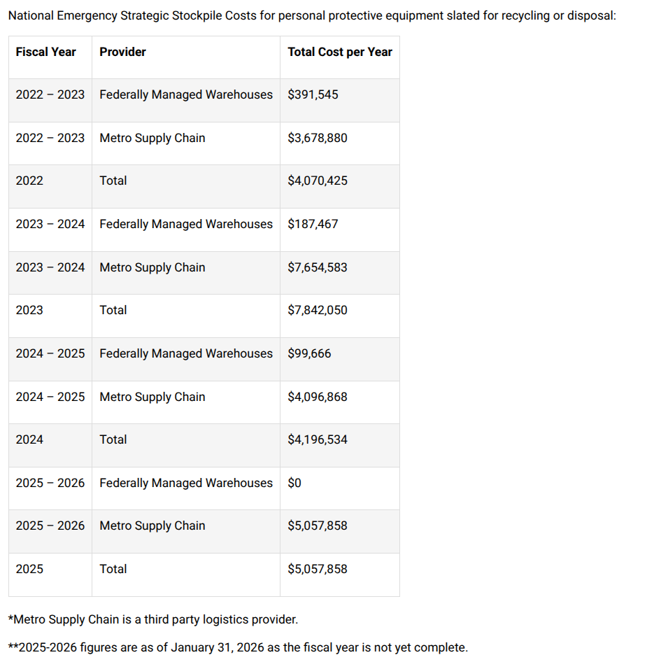 According to a response to Conservative MP Dave Epp’s Order Paper question Q-780, the federal government still held about 21 million expired pieces of personal protective equipment (PPE) in the National Emergency Strategic Stockpile as of January 31, 2026.