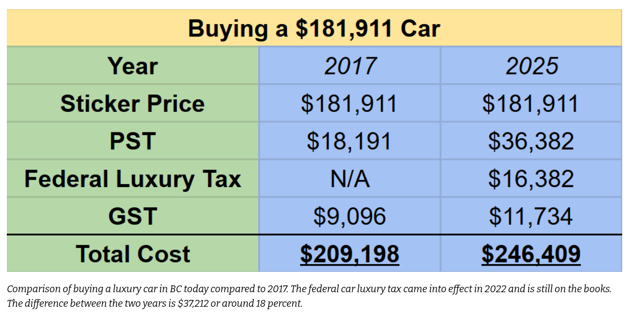 The province also continues to levy a luxury vehicle surtax of 15 percent on cars priced between $125,000 and $149,999.99 and 20 percent on vehicles priced at or above $150,000. The Ministry of Finance says it receives provincial sales tax revenues in lump sums from ICBC and dealers and does not break down how much comes specifically from luxury vehicle sales.